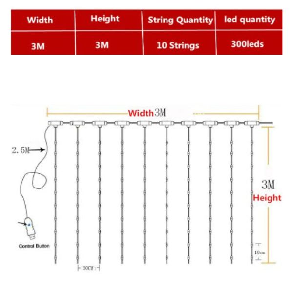 1 x CURLIGHT LED kardin (3 x 3 m) USB-ühendusega