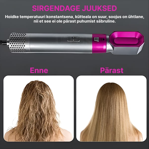 See sobib ideaalselt kõikidele juuksetüüpidele ning 5 erinevat otsikut võimaldavad teil juukseid kuivatada, lokitada, sirgendada, volüümi lisada ja kujundada.