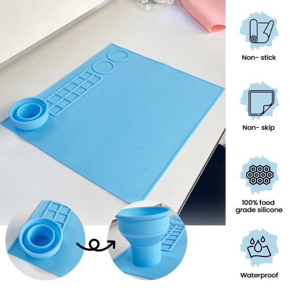 See 100% toiduks sobivast silikoonist valmistatud veekindel, mittekleepuv ja libisemisvastane matt sobib ideaalselt kõigi teie käsitööde jaoks. Tänu 14 lohule ja segamisalale sobib see ideaalselt oma tarvikute organiseerimiseks.