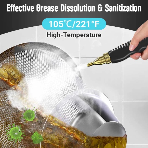 2500W nimivõimsus tekitab auru kuni 105℃ vähem kui 10 sekundiga, eemaldades kiiresti rasva, mustuse, tolmu ja plekid erinevatelt pindadelt.