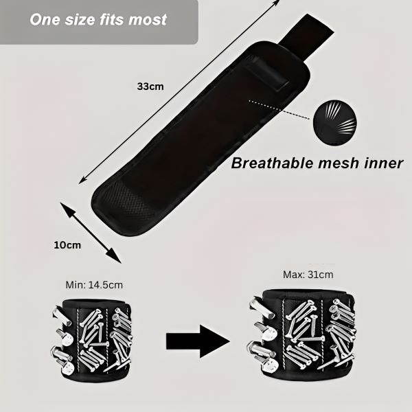 Hingavate, reguleeritavate rihmadega sobib see magnetiline randmepael enamiku randmesuuruste jaoks, tagades mugavuse pikema kasutuse ajal, hoides samal ajal käed vabana.