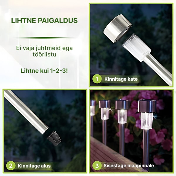 Kogemus muretust paigaldusest ilma juhtmeteta; lihtsalt torgake need maasse ja nautige kohest valgustust.