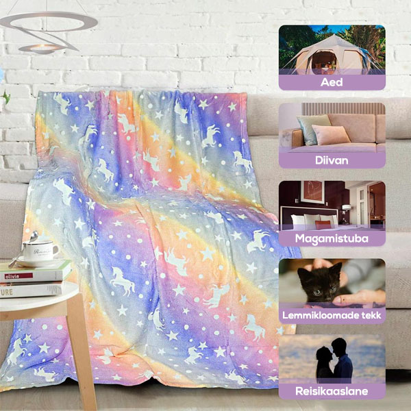 Hubane ja soe tekk kiirgab öösel valgust! Saate valida kas ükssarviku või dinosauruse mustri!