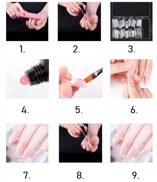 Kandke õhuke kiht Poly Gel‘i kunstküüne alla, seejärel saate kinnitada selle enda küünele. Pärast kuivamist UV/LED-valguse all eemaldage lihtsalt kunstküüned.