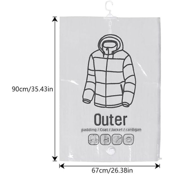 Maksimeeri oma garderoobi ruumi, hoides seda organiseerituna igal aastaajal. Kasutage neid rippuvaid kokkusurutavaid hoiukotte suurte, mahukate või aegunud ülikondade, kleitide, paksude vestide, jakkide ja mantlite hoiustamiseks oma riidekapis. Meie vaakumkindlad hoiukotid kaitsevad teie riideid vee ja lõhnade eest, mistõttu on need ideaalsed pikaajaliseks kasutamiseks.
