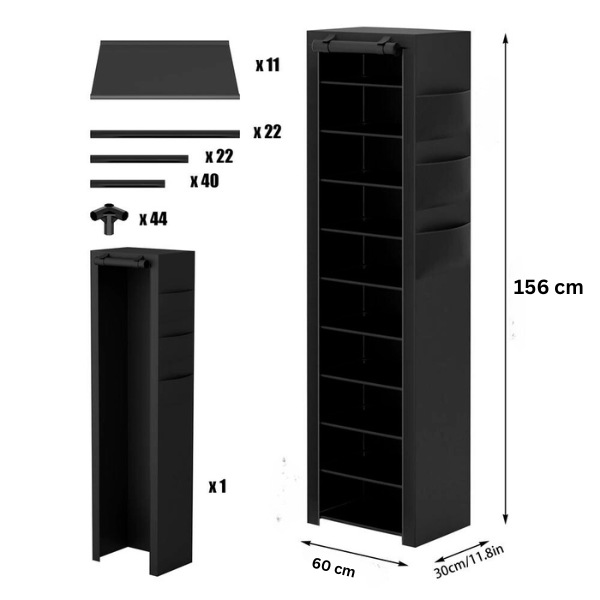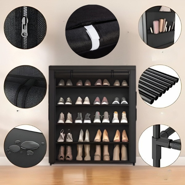 Varustatud tolmukindla kangast katte ja tõmblukuga. See jalanõude riiul tagab, et teie jalanõud püsivad puhtad, kaitstes neid tolmu ja mustuse eest.