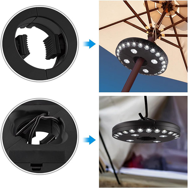 Erinevalt tavalistest vihmavarju valgustitest töötab BRELLAGLO seal, kus seda vajad. Kinnita see terrassivalgustuseks vihmavarju külge või kasuta sisseehitatud konksusid riputamiseks—ideaalne telkimiseks ja väliseiklusteks.